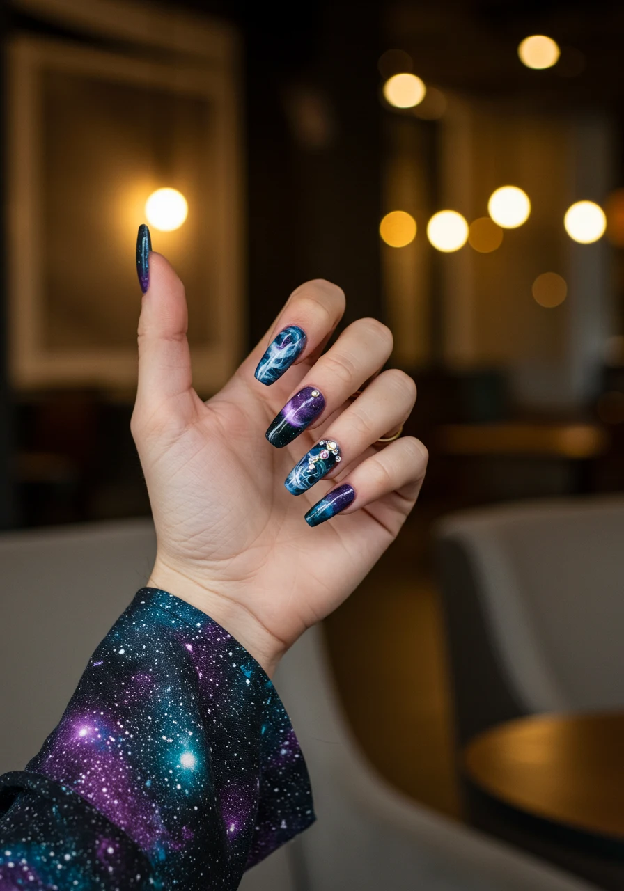Cosmic-inspired ballerina nails are perfect for dreamers and stargazers. Deep blues, purples, and blacks blended with glitter and rhinestone “stars” create an ethereal galaxy effect.