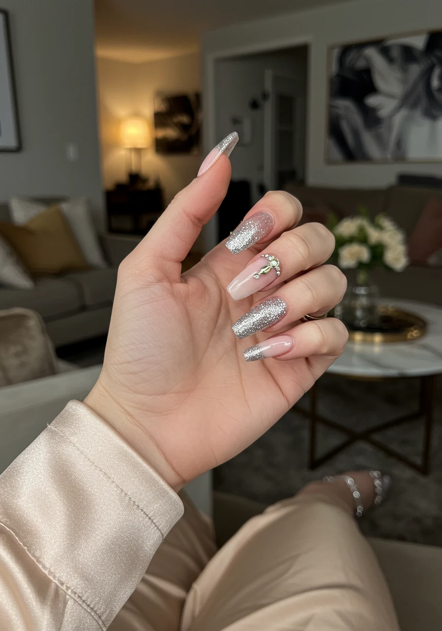 Ombre sparkle ballerina nails are perfect for those who love drama with subtlety. The soft gradient from nude, blush, or pastel tones into deeper shades at the tips creates a dreamy, flowing effect. Adding layers of fine glitter catches light and adds a luxurious shimmer.