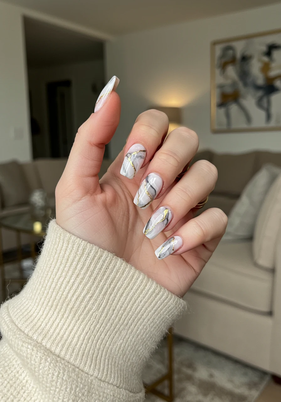Marble nails offer timeless sophistication for ballerina nail designs. Swirls of grey, white, and metallic veins create an elegant, stone-like effect. Fine details like gold leaf or silver accents elevate the luxe feel. A glossy finish completes the illusion of polished marble.