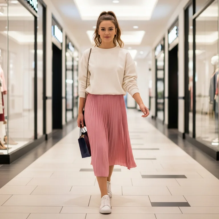 Comfortable top with feminine bottom balances perfectly. This outfit combination feels interesting naturally. The mix looks intentional!
