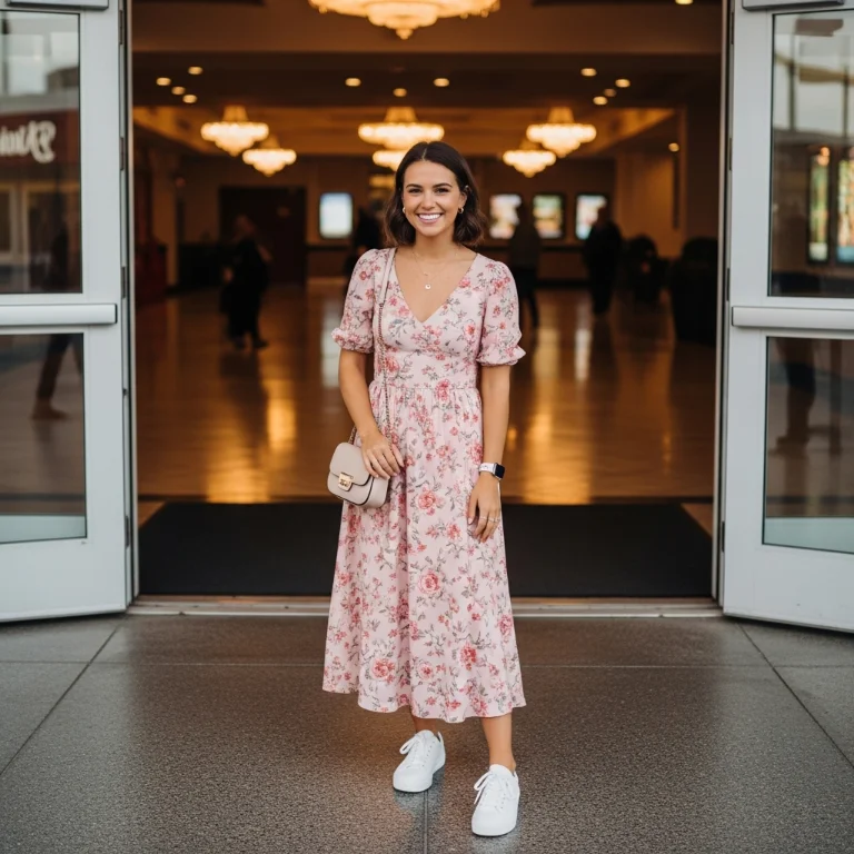 Pretty dress with comfortable shoes balances perfectly. This outfit combination feels relaxed naturally. The mix looks intentional!