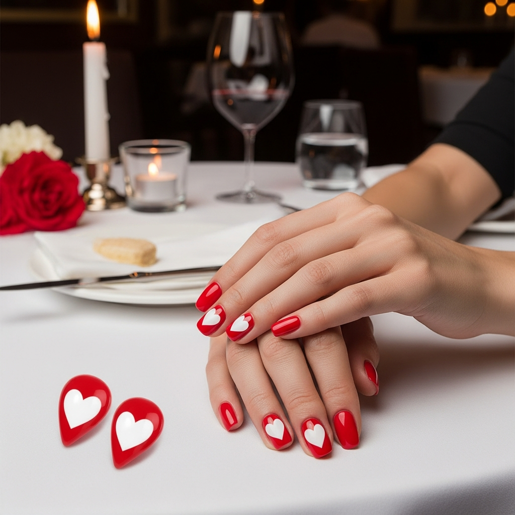 These heart nails feel bold and romantic. White on red is stunning. Perfect contrast love!