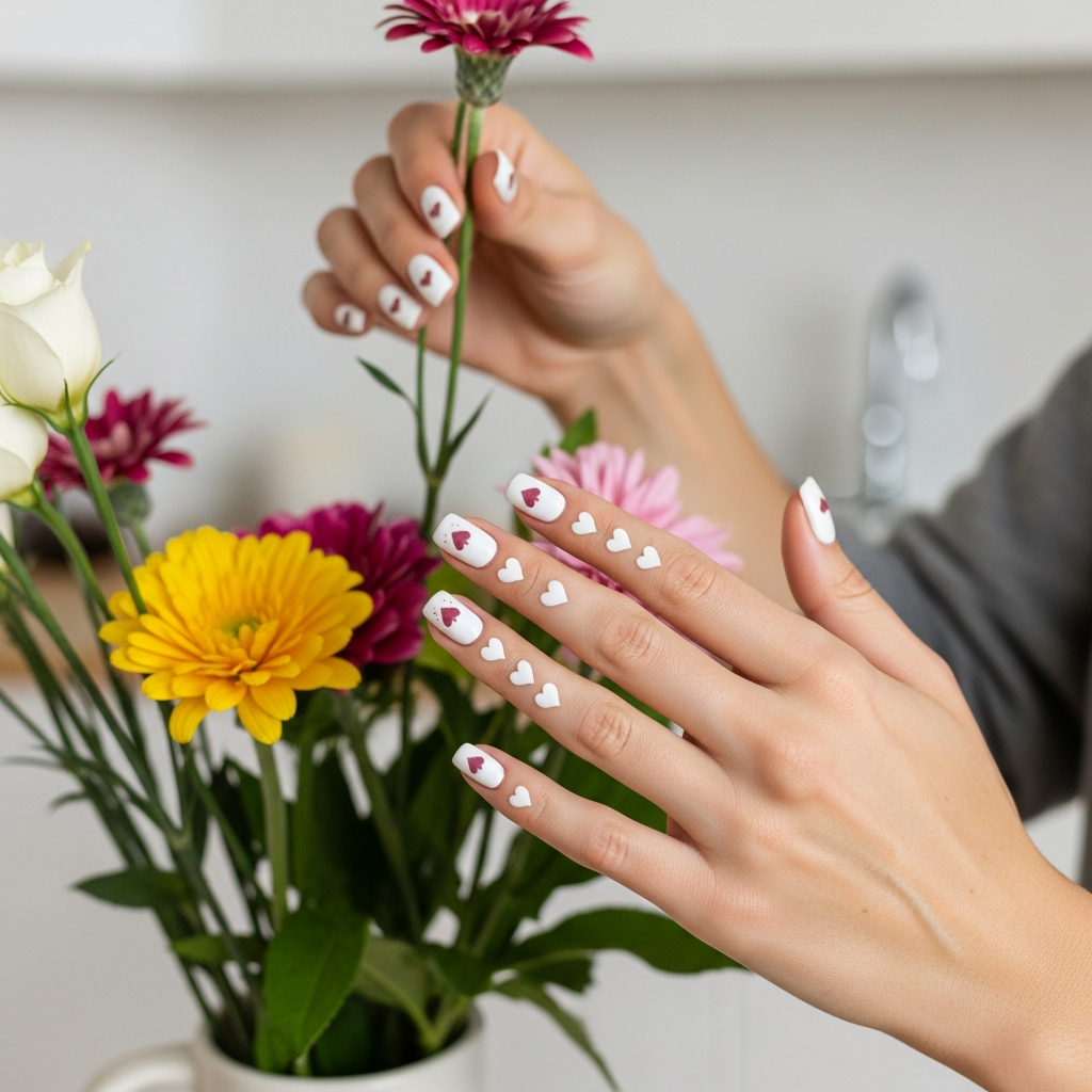 Paint solid background color on all nails. Arrange hearts from tiny at cuticle to larger at tips. The graduated sizing creates intentional artistic flow.