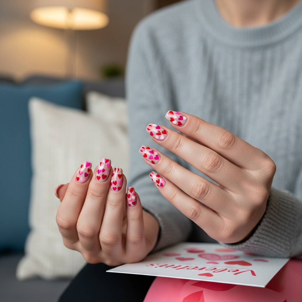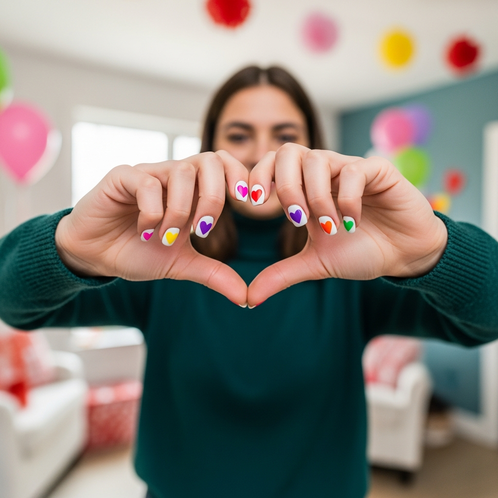 Apply your base color on all nails first. Add numerous tiny hearts in various colors scattered randomly. The confetti effect feels celebratory and sweet.