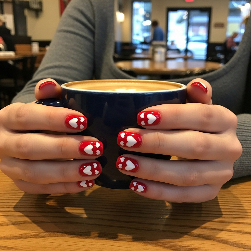 Paint all nails bright or deep red completely. Add white heart designs in various sizes across nails. The contrast makes each heart visible and beautiful.