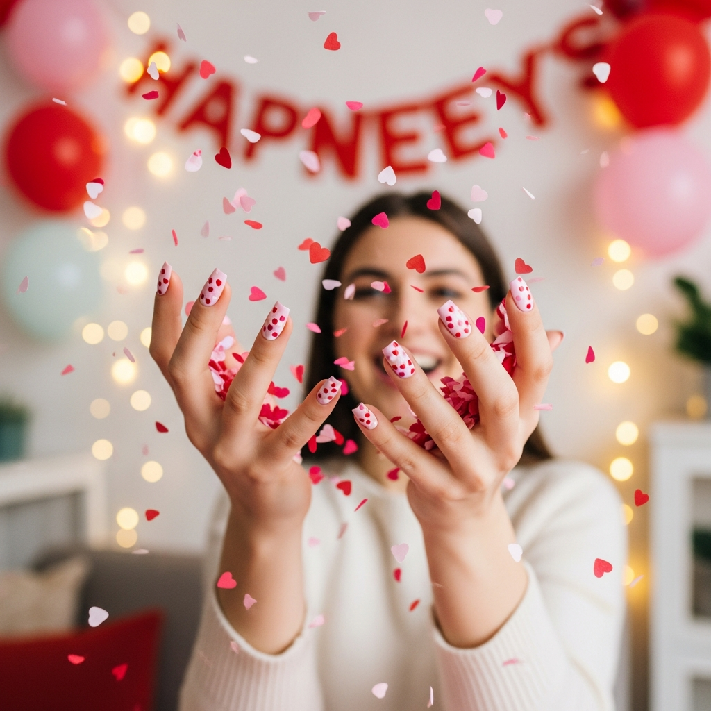 Multiple tiny hearts create confetti celebration effect. This nail art mimics love floating everywhere joyfully. The scattered placement feels organic and happy.