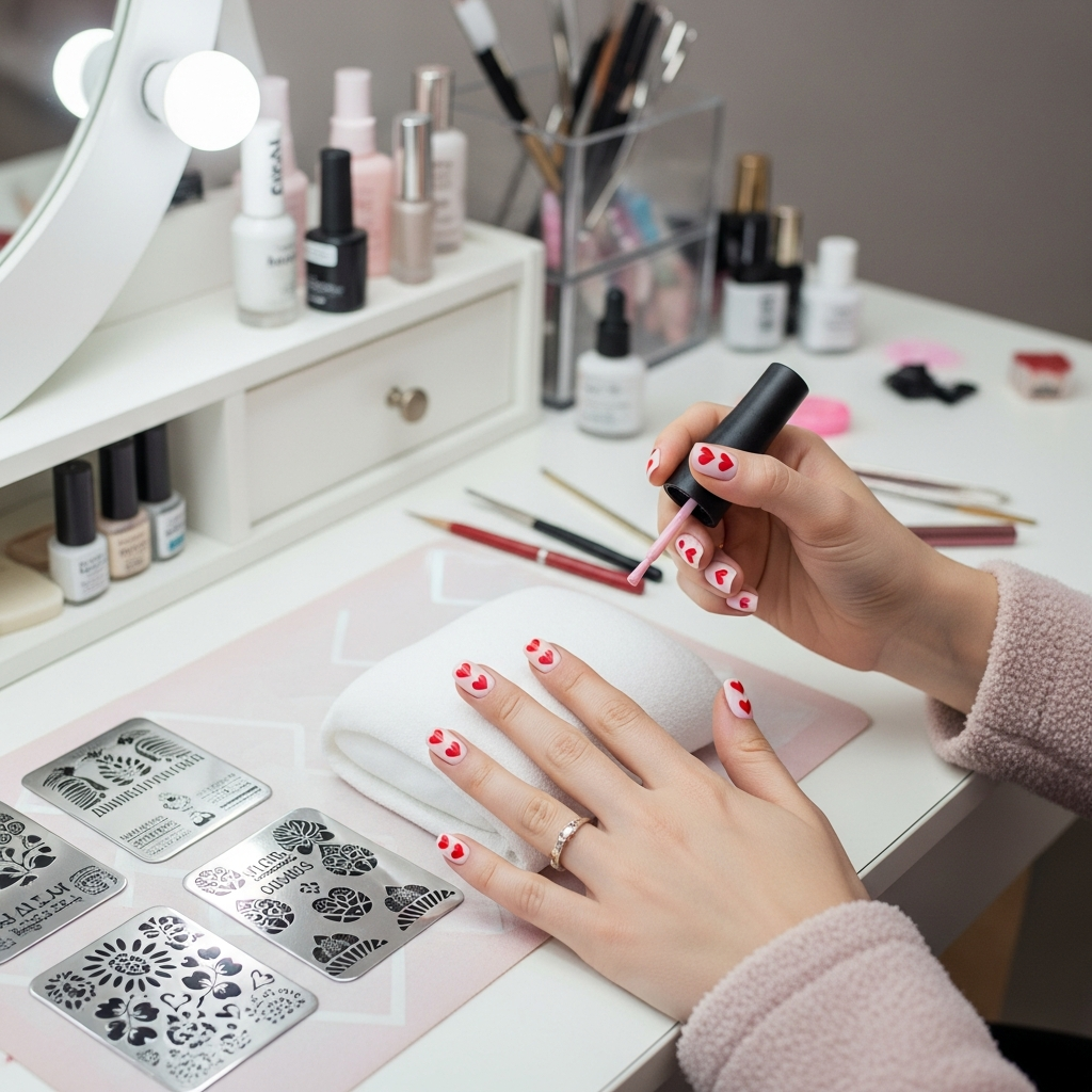 Use Valentine’s stamping plates with heart patterns carefully. Stamp over pink, red, or white bases for effects. The precision creates identical perfect hearts across nails.