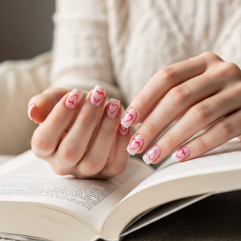 Use thin brush to paint just heart outlines on nails. Leave centers empty showing base color through. The minimal approach feels modern and chic.