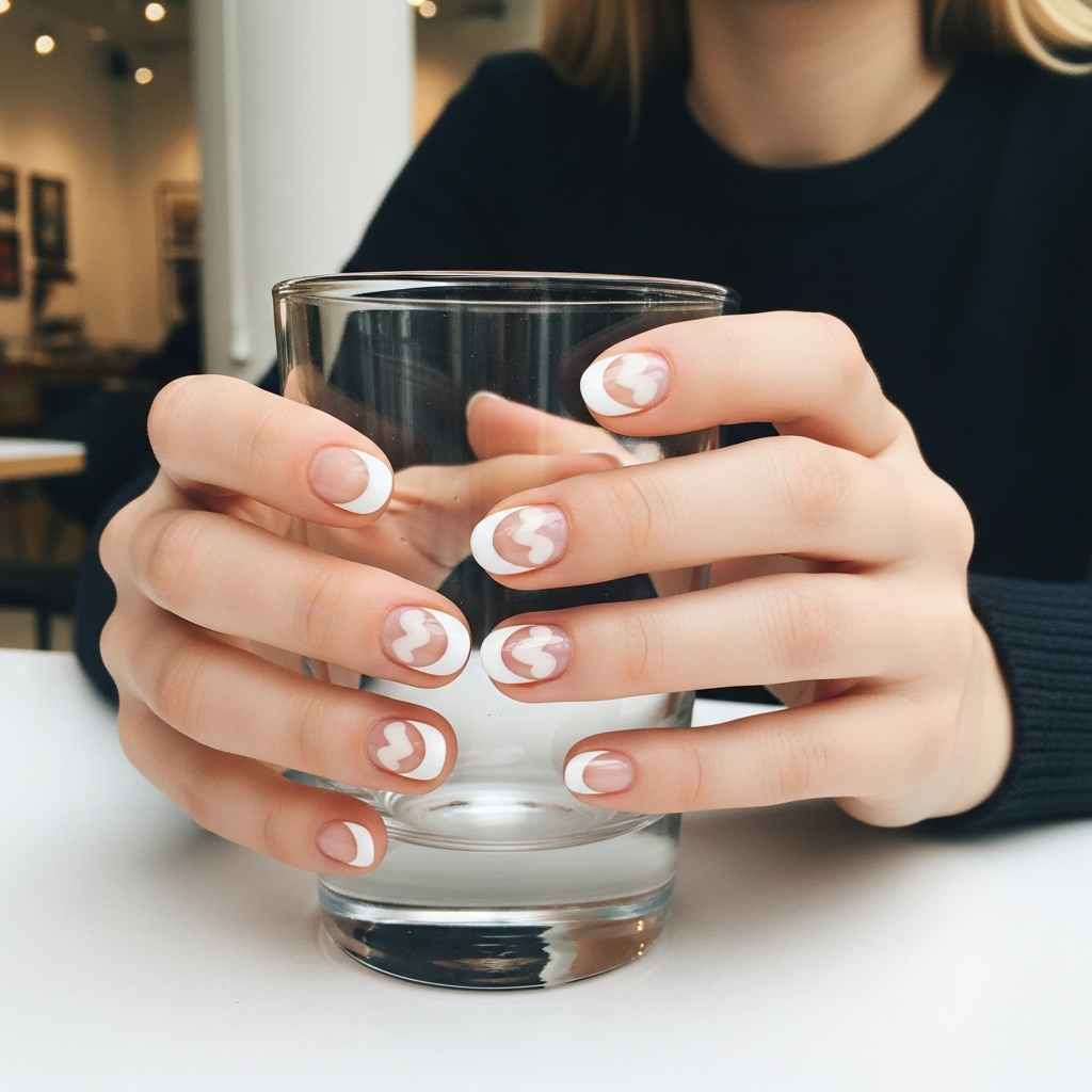 Paint natural beige base and white French tips traditionally. Then add one small heart on each tip carefully. Center them or place asymmetrically for modern flair.