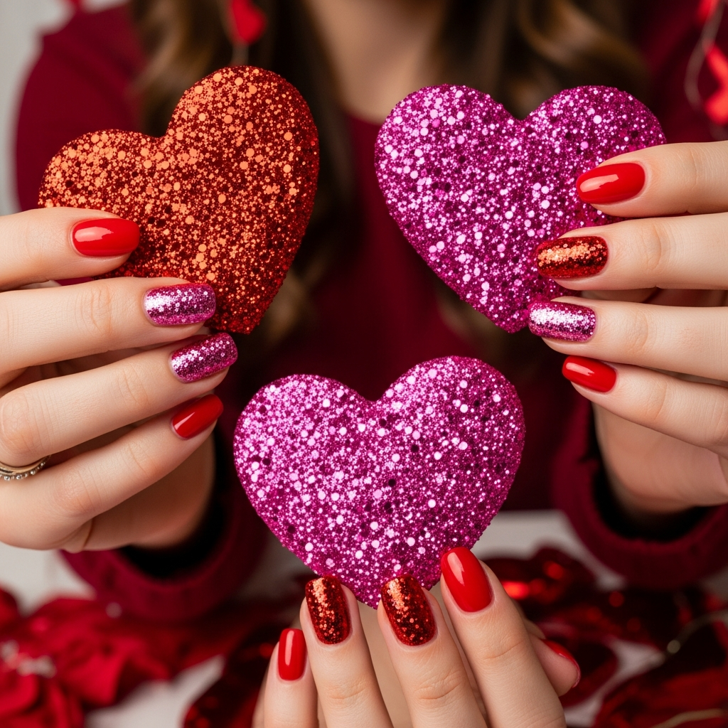 Paint your base color completely first. Use thin brush to outline heart shapes and fill with glitter polish. Scatter them randomly for organic love-is-everywhere feeling.