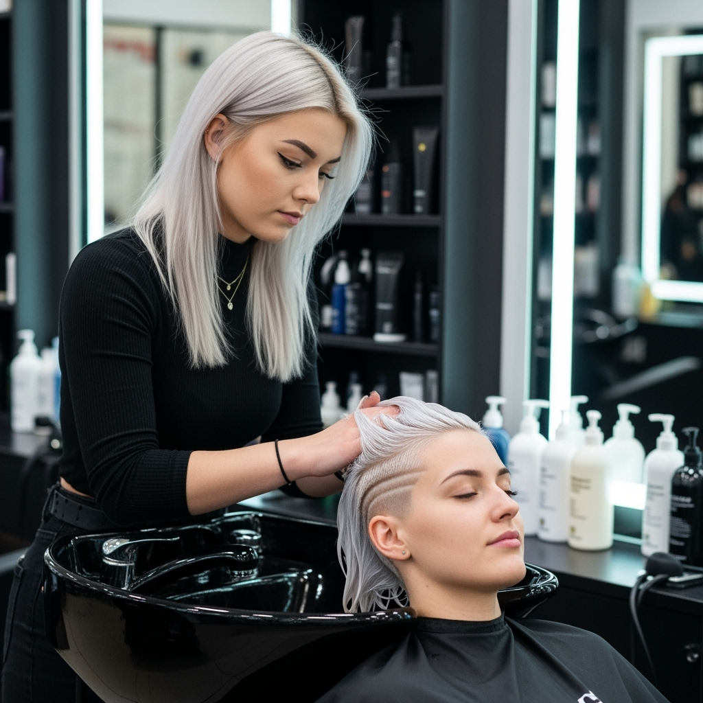 The contrast of sleek, snowy lengths against the graphic shaved detail makes this look both angelic and rebellious. The long strands can be worn glass-smooth, waved for mermaid texture, or braided into intricate accents, making it versatile for both high-fashion and everyday cool. The snowy white tone reflects light beautifully, enhancing cheekbones and eyes while ensuring this look stands out in any crowd.