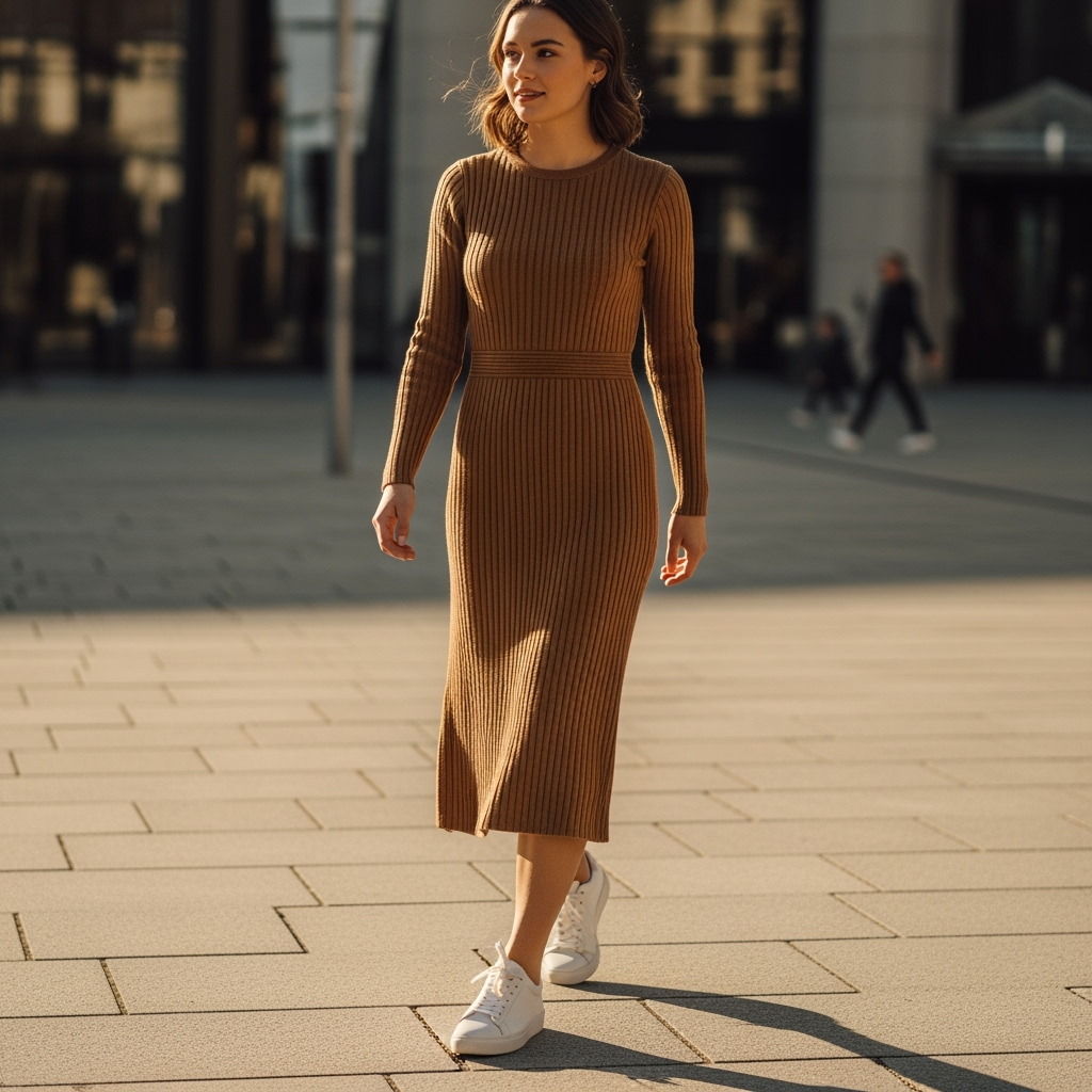 This combo proves you don’t need heels to be stylish. A ribbed knit dress skims the body without clinging, offering comfort and shape in equal measure.