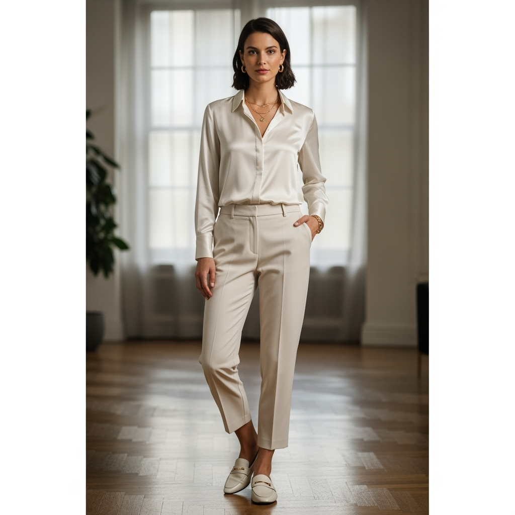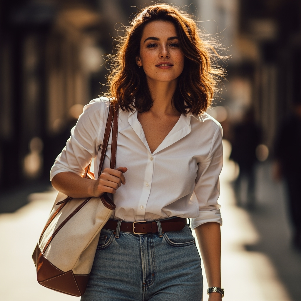 Opt for a cotton or linen shirt in warmer months for breathability, or a silk blend for a more elevated vibe. The beauty of this combo is in its flexibility: sneakers and a tote bag for brunch, ballet flats and a crossbody for errands, loafers and a structured blazer for meetings.