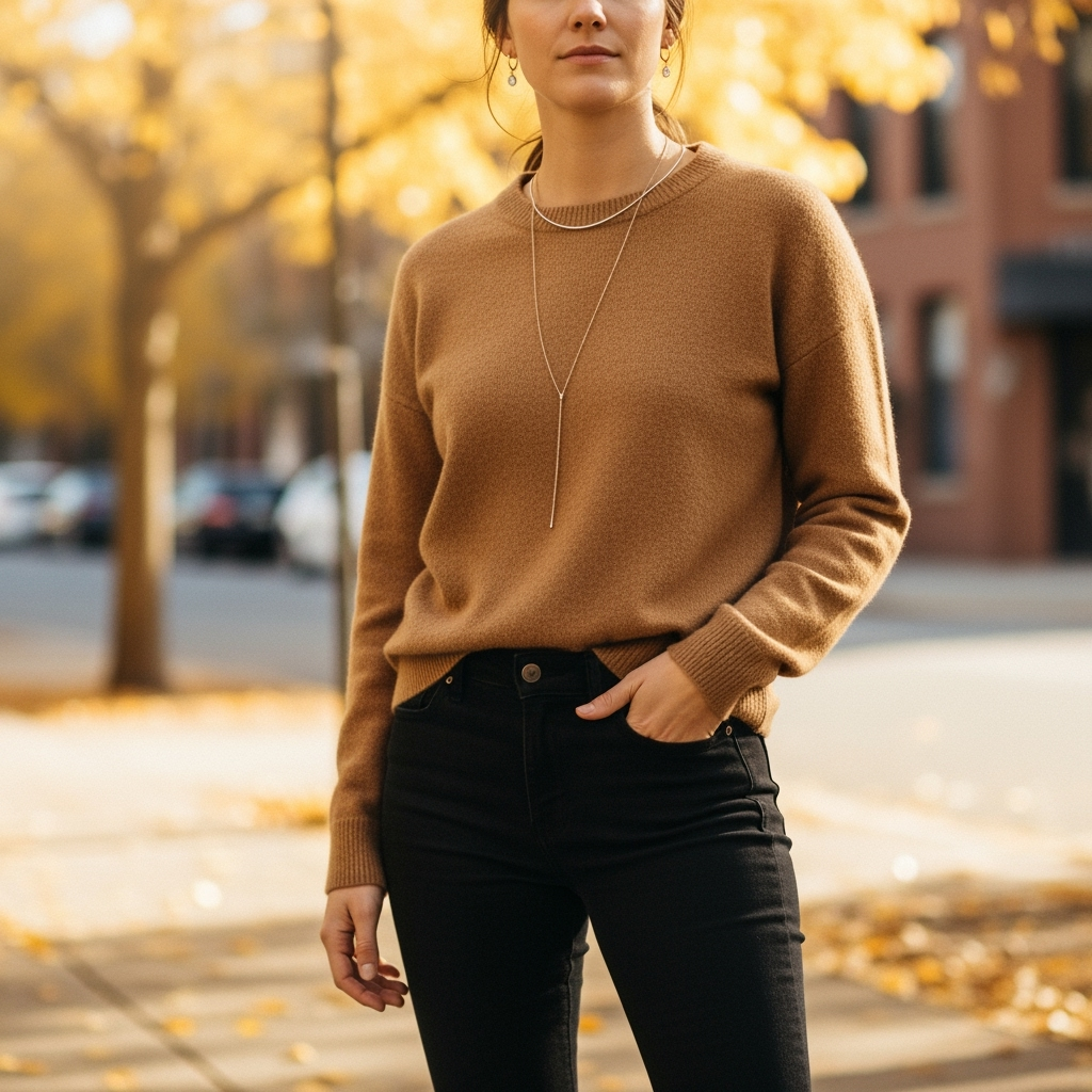 Minimal but striking, this color pairing is an instant win. Black jeans slim the silhouette, while a camel sweater brings warmth and richness to the outfit. In winter, add a wool coat; in fall, switch to a suede jacket.