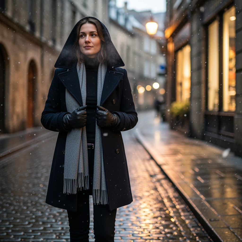 A navy or black pea coat exudes that old-Hollywood, walking-through-a-European-city vibe. Layer it over a fine-knit turtleneck, and you have a timeless, cold-weather uniform.