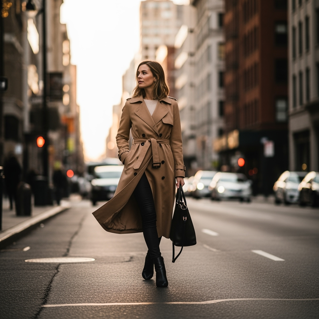 Choose a trench with a belt for waist definition, and finish with ankle boots or clean white sneakers. For colder weather, layer a chunky knit underneath; in spring, keep it light with a striped tee.