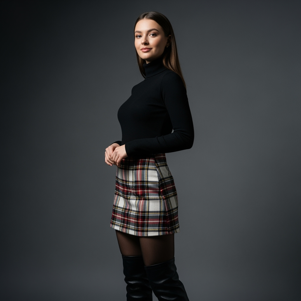This look walks the line between preppy and sleek. A fitted black turtleneck elongates your frame, while a plaid mini skirt brings in a playful element.