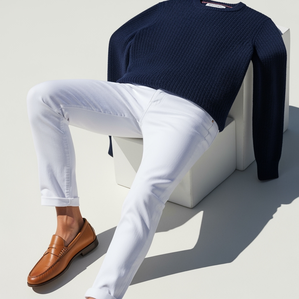Crisp, clean, and a little nautical, this combination always looks fresh. The deep navy grounds the brightness of the white jeans, making it perfect for spring and summer but stylish enough for fall with the right coat layered over.