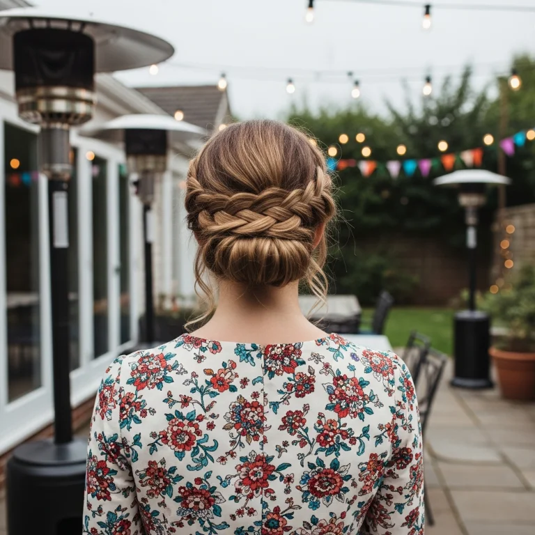 Create braid along hairline wrapping around head. Tuck remaining hair into low bun underneath. Secure everything with pins for stability always.
