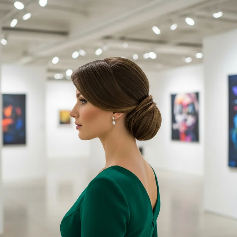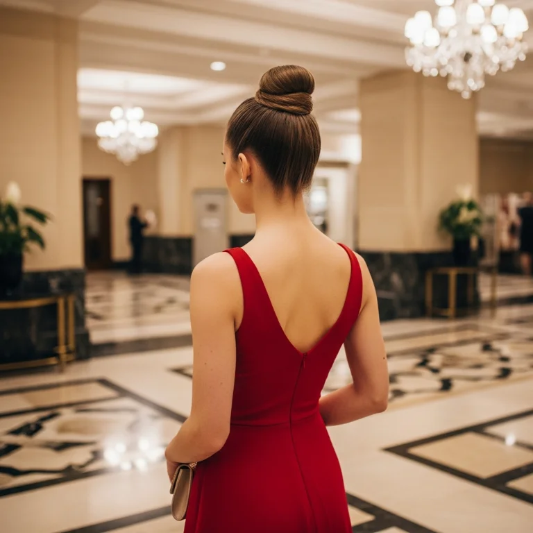 Refined high bun adds dramatic height. This updo creates clean elegant lines. The height makes you feel confident and poised naturally.