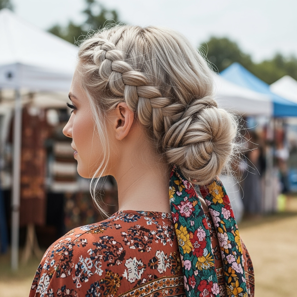 Loosen the braid for volume before pinning. Add a patterned scarf tied at the bun base to complete the look.