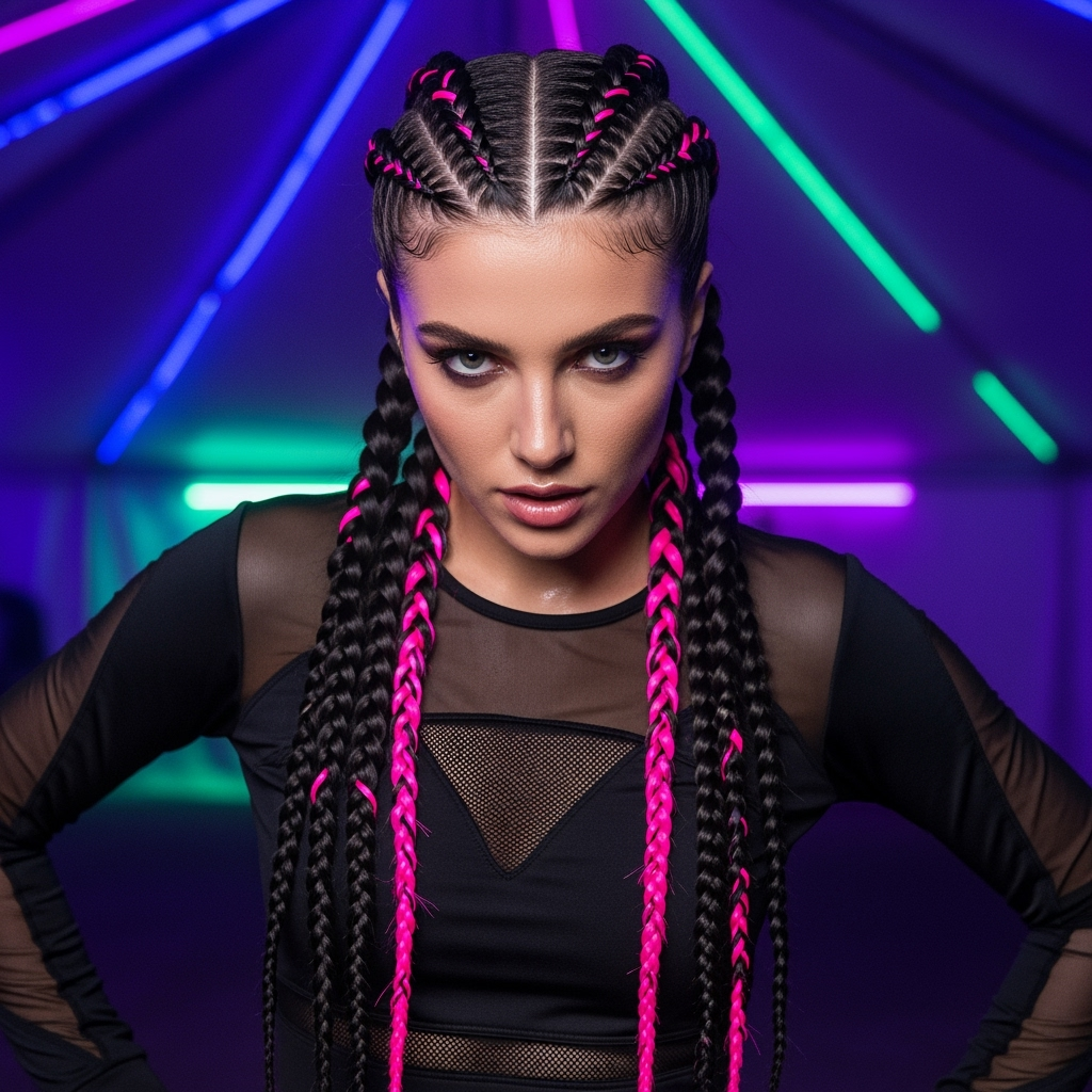 Clip in neon or pastel extensions into the central braid for a knockout visual. This one’s impossible to ignore especially with glitter roots and bold earrings.