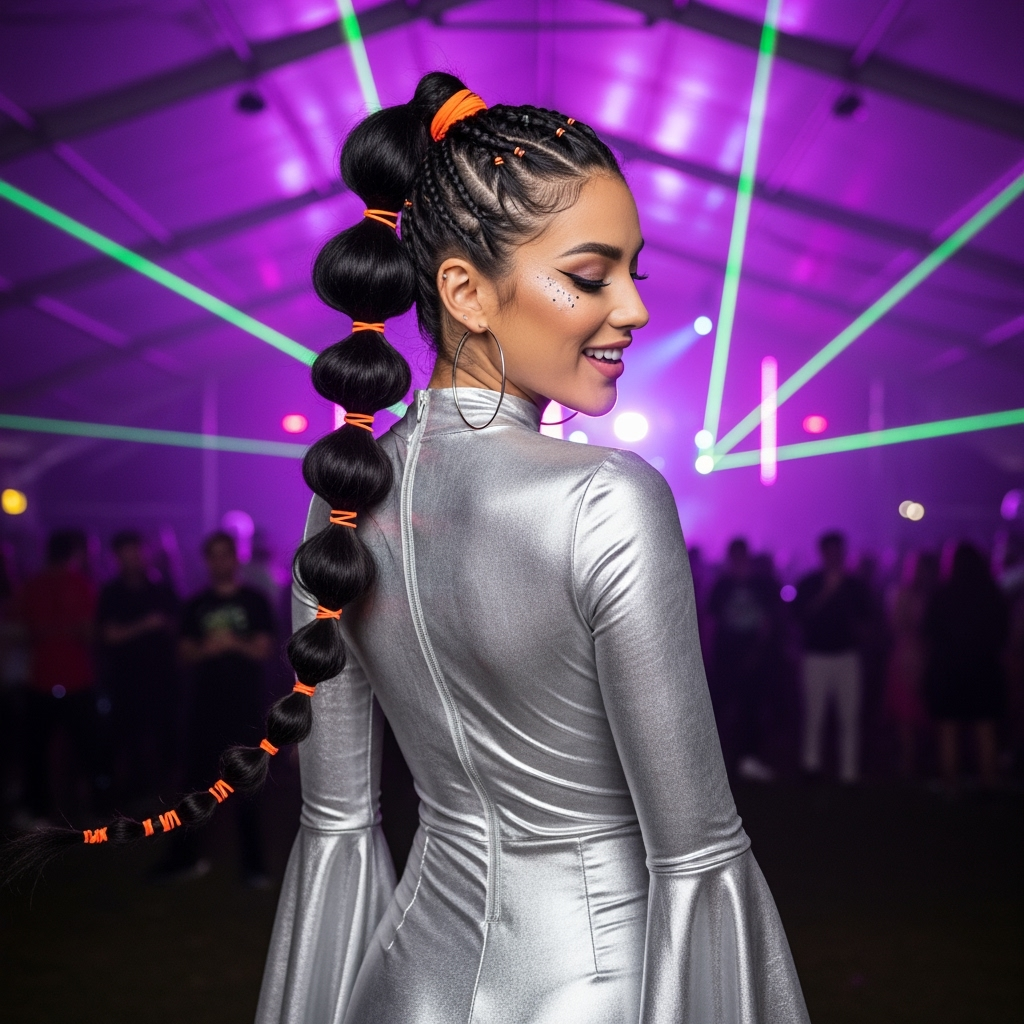Clip in colorful extensions before you start for multi-tonal bubbles. Clear elastics blend, colorful ones pop choose depending on your outfit mood.They stay poofy even when you’re dancing in the crowd. Perfect for pairing with bold glitter makeup and retro sunglasses.