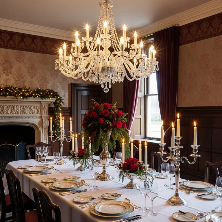Crystal or traditional fixture creates sophisticated focal point. This dramatic lighting defines elegant holiday meals. The chandelier dazzles!