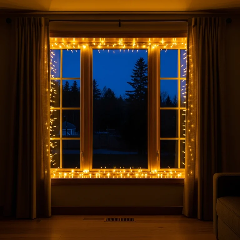 Drape string lights around interior window frames completely. The twinkling borders create magical indoor Christmas atmosphere. Your window lights glow gorgeously!