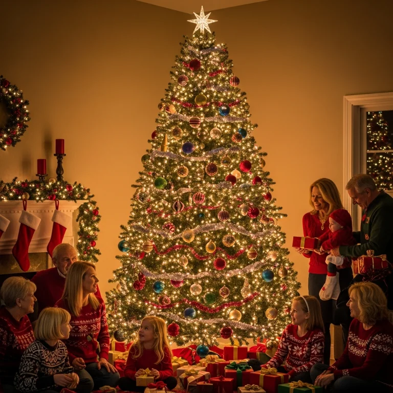 Fully lit tree becomes ultimate holiday focal point. This essential decoration creates instant festive feeling. The tree glows!