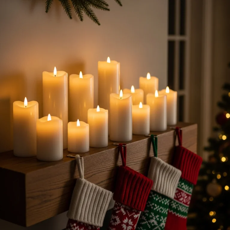 Group pillar candles on mantels and side tables. The flickering flames create warm indoor Christmas feeling. Your candle lights flicker beautifully!