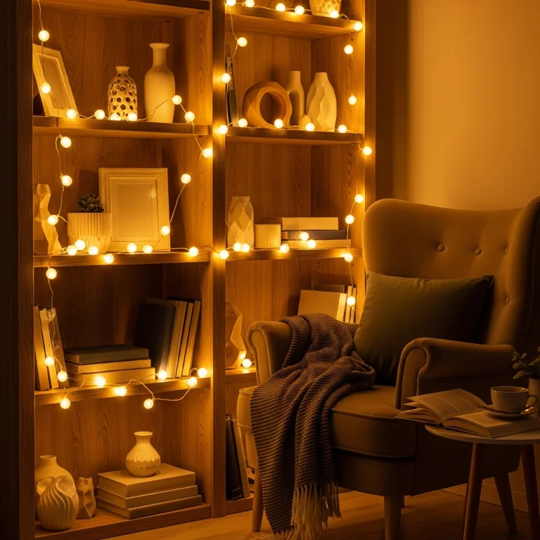 Weave string lights through bookshelf items creating glow. The unexpected lighting adds magical indoor Christmas character. Your shelf lights surprise perfectly!