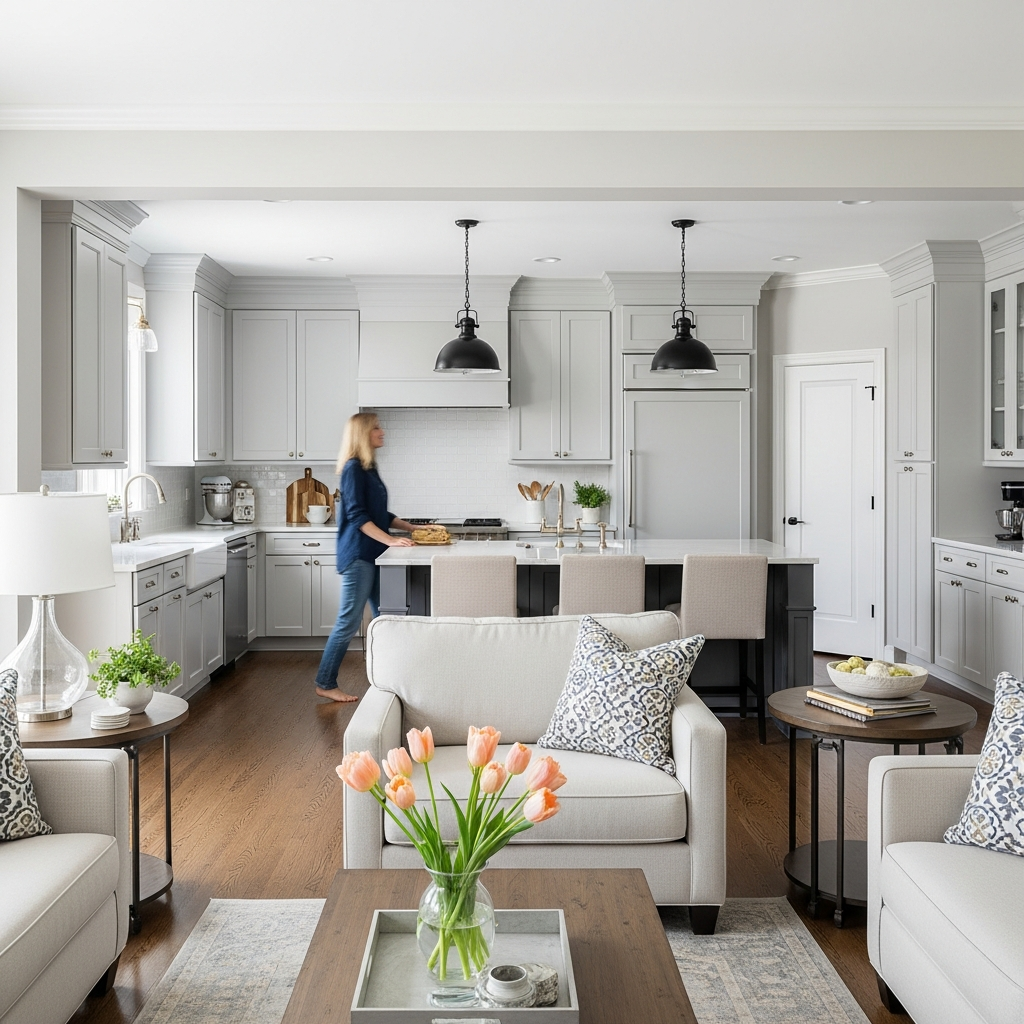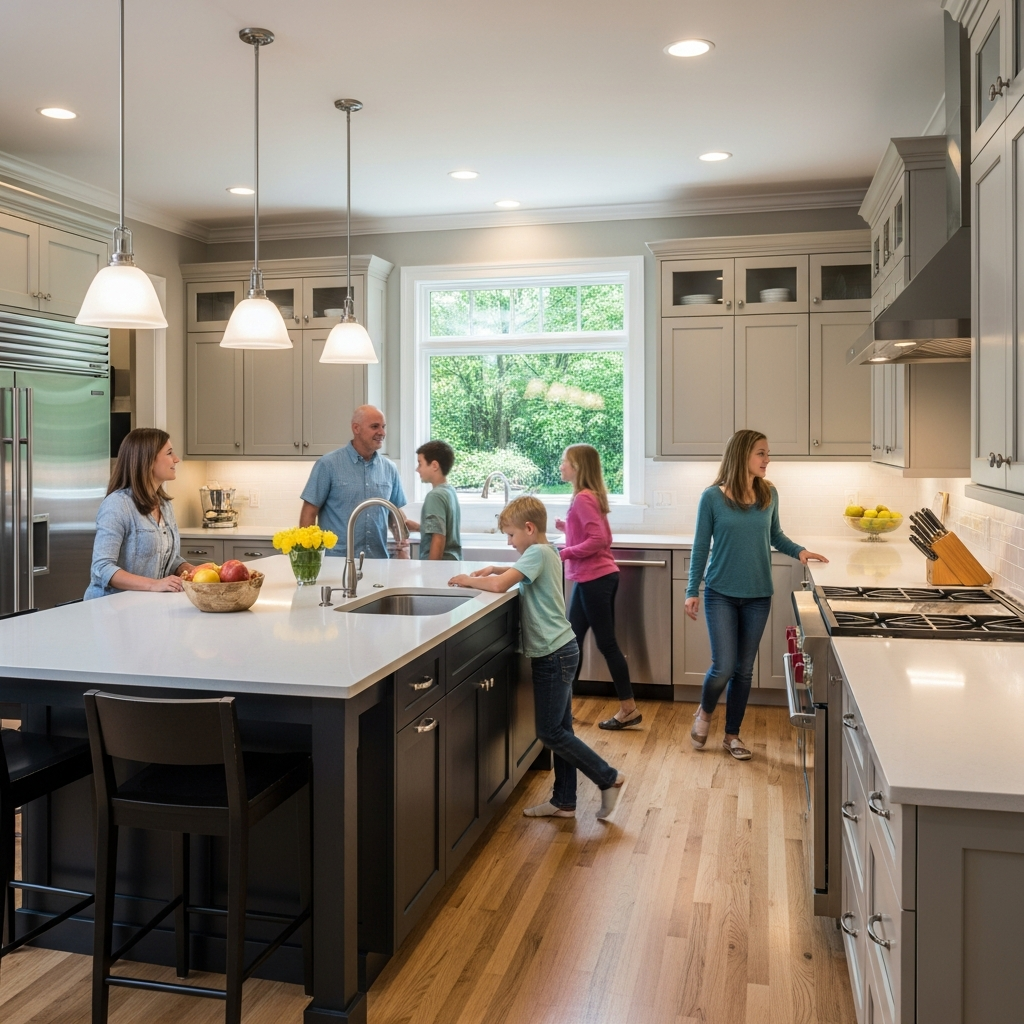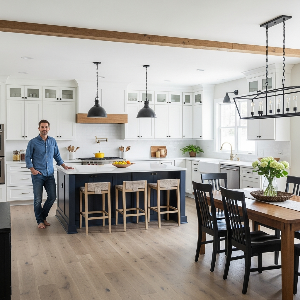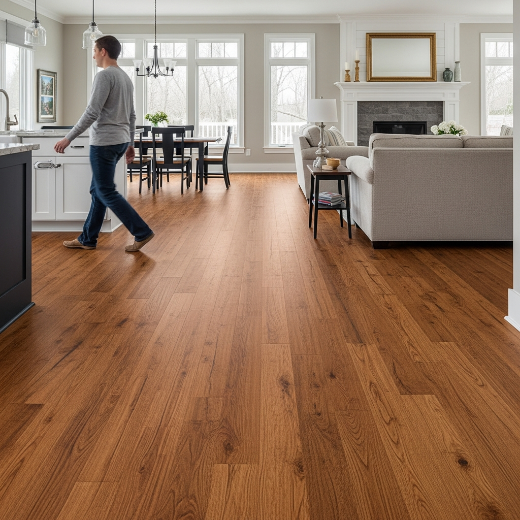 Extend same hardwood across open areas. The continuous floor makes spaces feel larger. Your unified kitchen flows seamlessly!