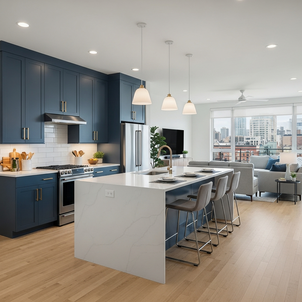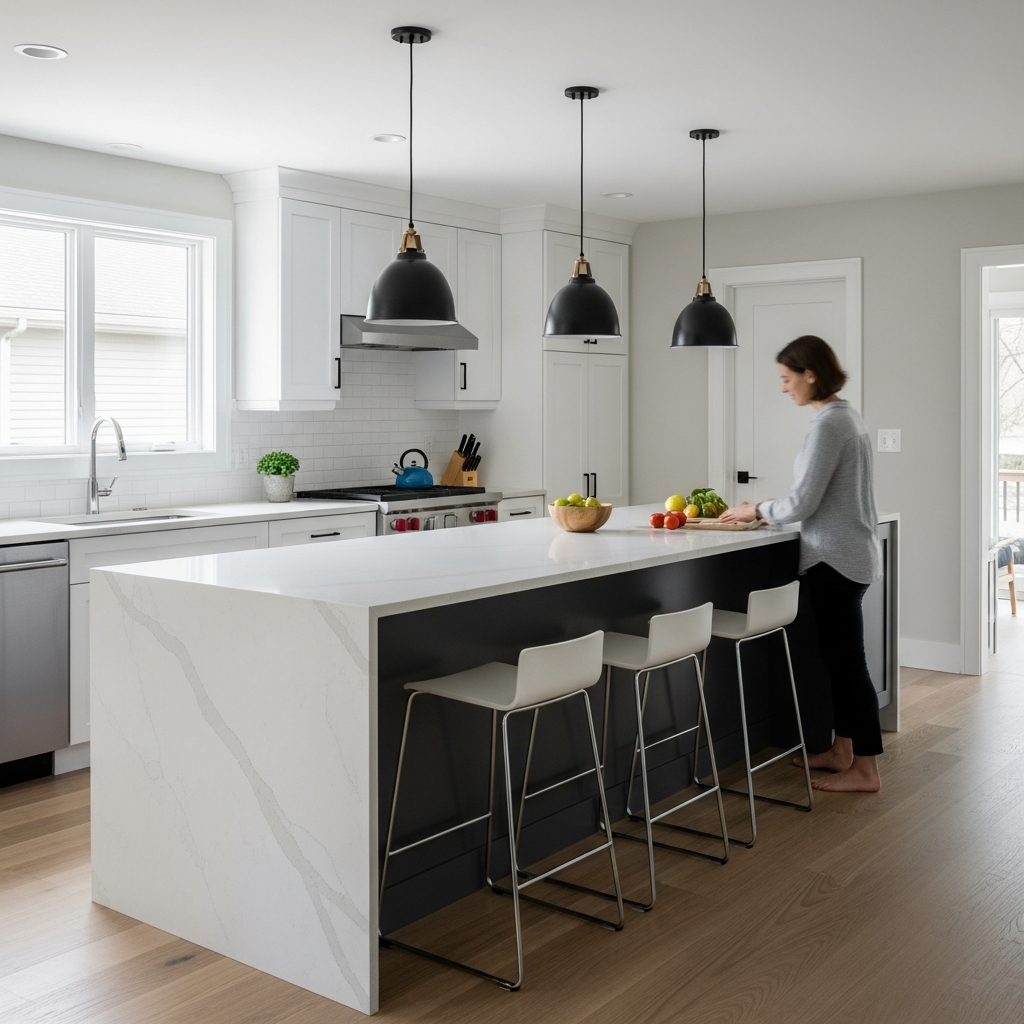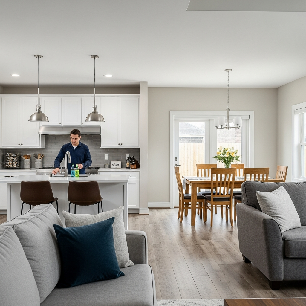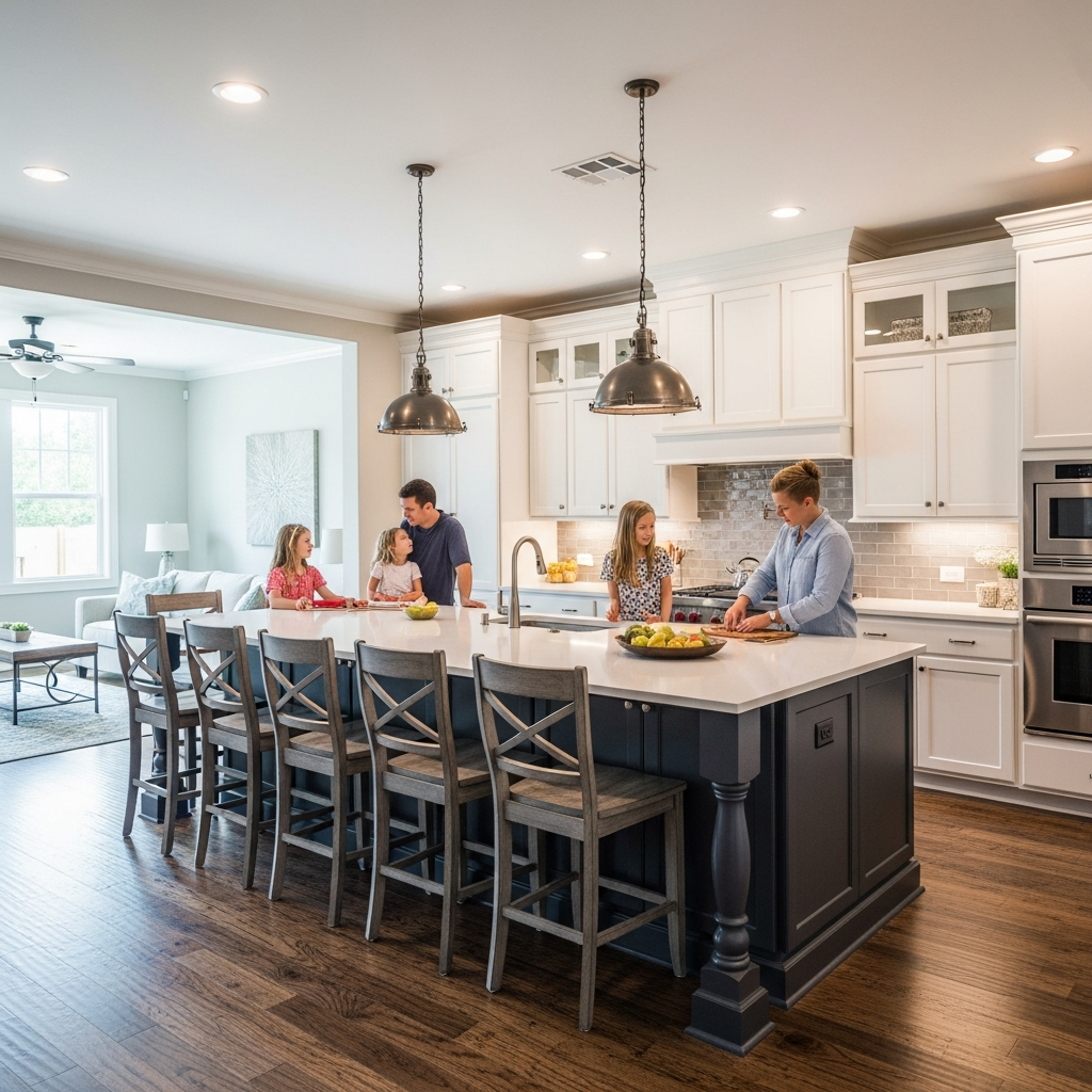 Extend same hardwood across open areas. The continuous floor makes spaces feel larger. Your unified kitchen flows seamlessly!