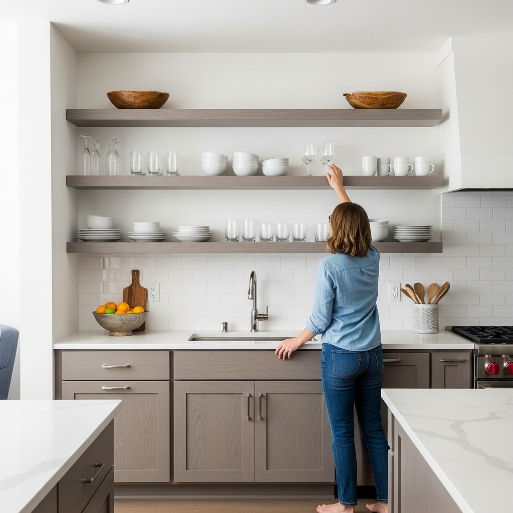 Replace some upper cabinets with shelves. The open look maintains visual flow. Your airy kitchen stays light!