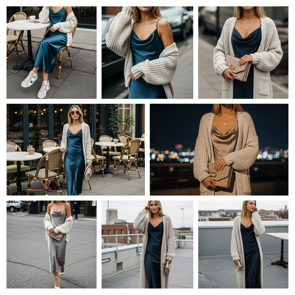 The slip dress feels evening-ready on its own, but the cardigan makes it daytime-appropriate while keeping you comfortable. For brunch, wear with sneakers or ankle boots; for night, lose the cardigan, add heels and a clutch. In transitional weather, throw on a denim jacket for a modern casual touch.