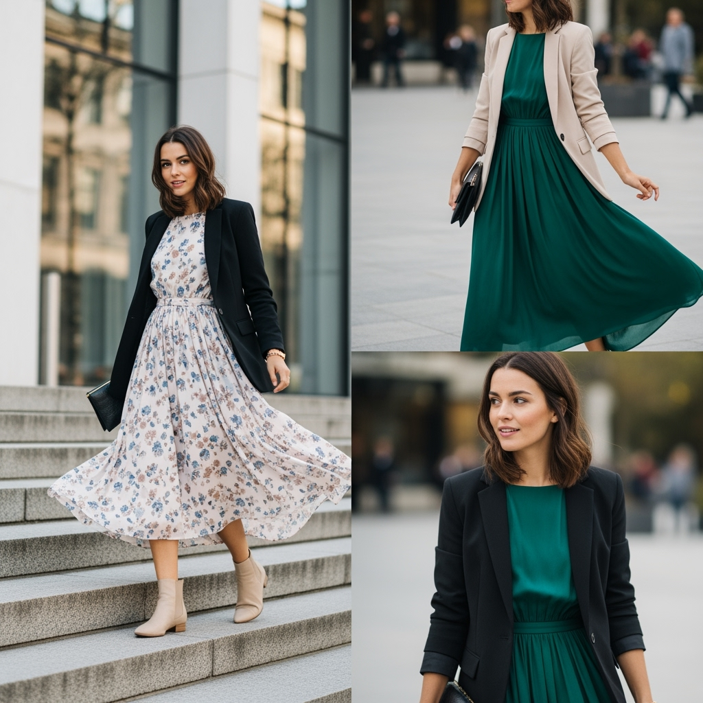 For the office, wear with pointed-toe flats or ankle boots. For dinner, switch to heeled sandals and a clutch. Color-wise, let the dress add personality (soft blues, deep greens, or muted prints) while keeping the blazer neutral for maximum re-wearability. In fall, layer with tights and a camel coat on top.