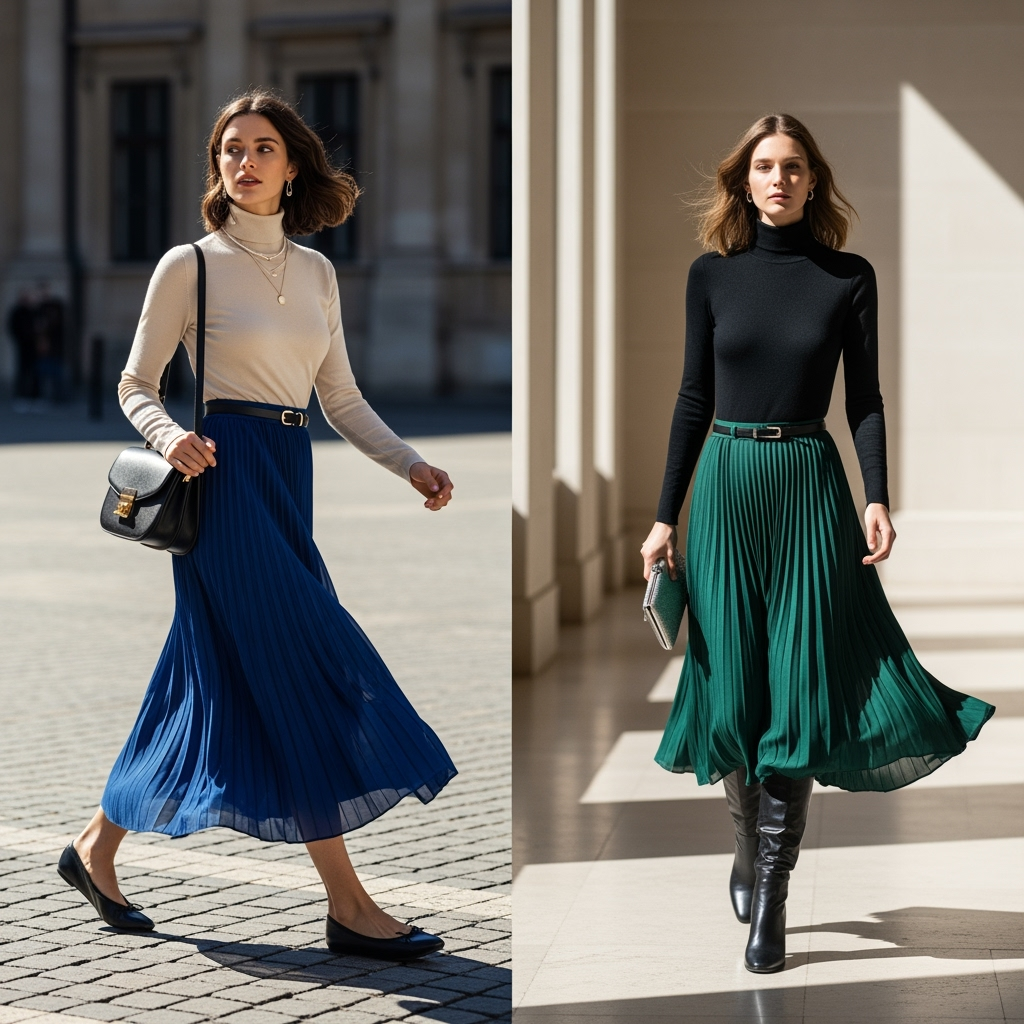 Go monochrome for a sleek, elongated effect, or mix a neutral turtleneck with a jewel-toned skirt for a pop of color. In cooler months, add knee-high boots and a long wool coat; in spring, swap for ballet flats. This look works equally well for a museum day, a casual Friday at work, or a coffee date.
