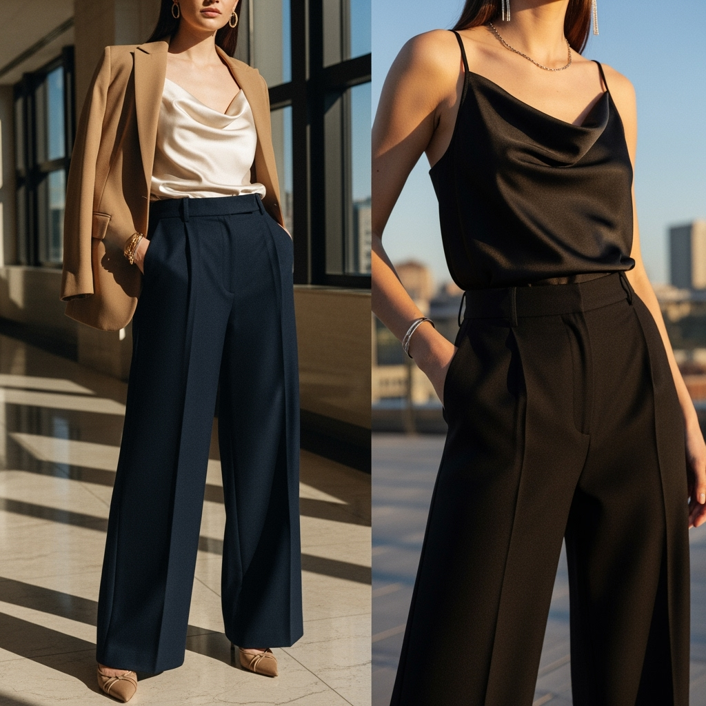 Soft meets structured in the most flattering way. A silk camisole drapes effortlessly over the body, catching light subtly, while wide-leg pants add drama and sophistication. For the office, layer a blazer on top and choose trousers in tan, navy, or black.