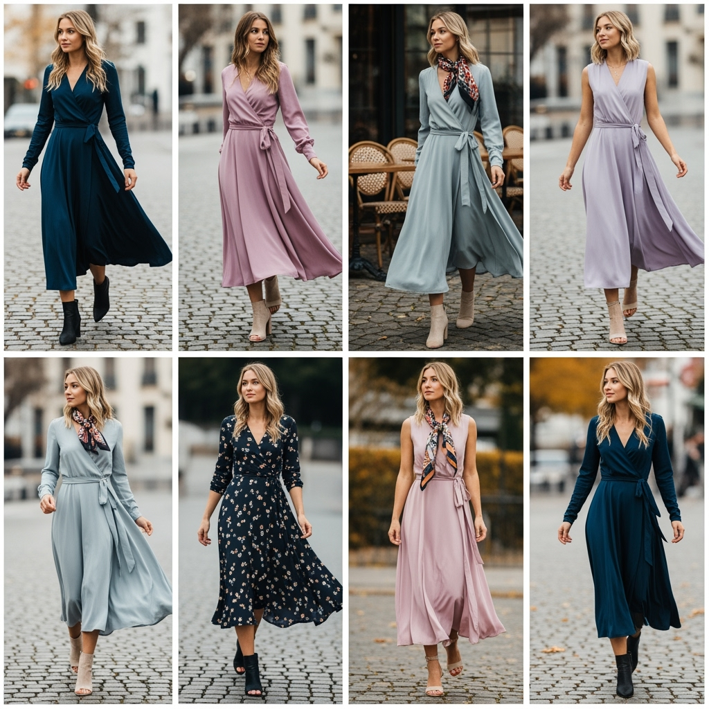 The wrap dress is universally flattering  it defines the waist, skims the body, and feels incredibly comfortable. Paired with ankle boots, it strikes the perfect balance between casual and dressed-up.