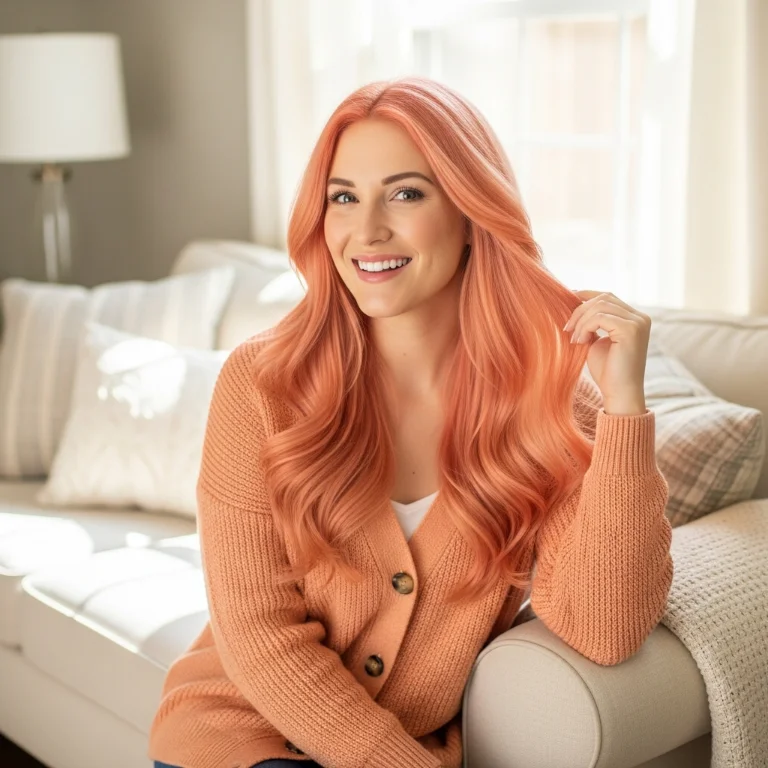Peachy-pink with orange undertones adds energy. This hair shade feels bright and happy. The coral tone looks cheerful!