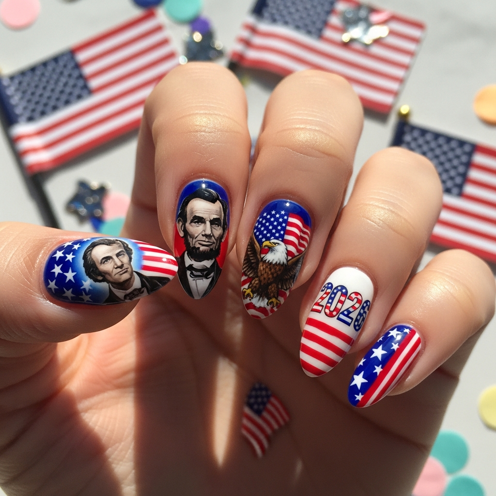 These Presidents Day nails honor symbols respectfully. Flag accent is meaningful. Perfect direct tribute!