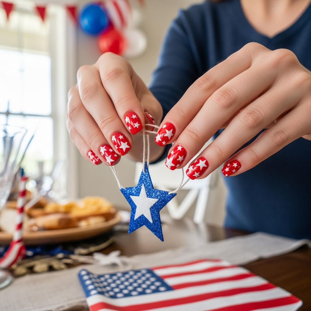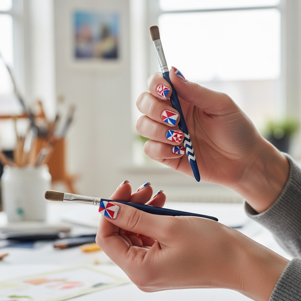 Use tape to divide nails vertically or diagonally. Paint one half red and other half blue carefully. The split creates striking visual patriotic impact.
