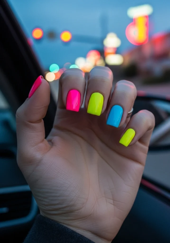 For the extrovert who wants nails to pop in every roadside snapshot. Choose a palette of high-visibility neon think hot pink, fluorescent lime, electric sky blue, and citrus yellow and give each nail a single bold color.