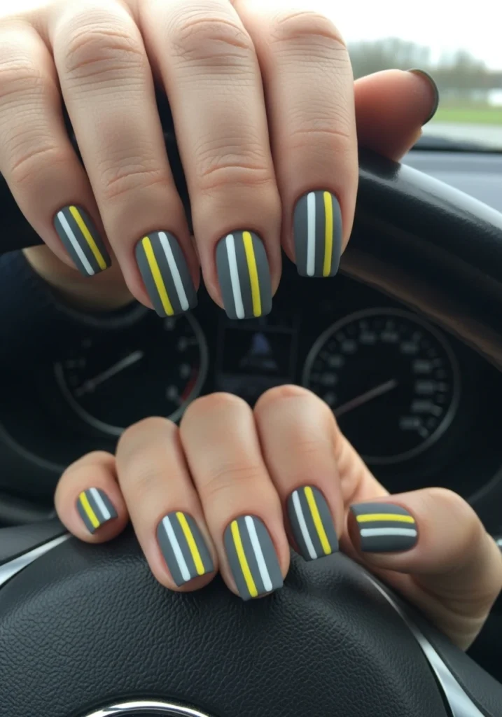 A matte asphalt-grey or jet-black base becomes your personal “highway,” with crisp white or bright yellow vertical lines painted down the center to mimic road markings.