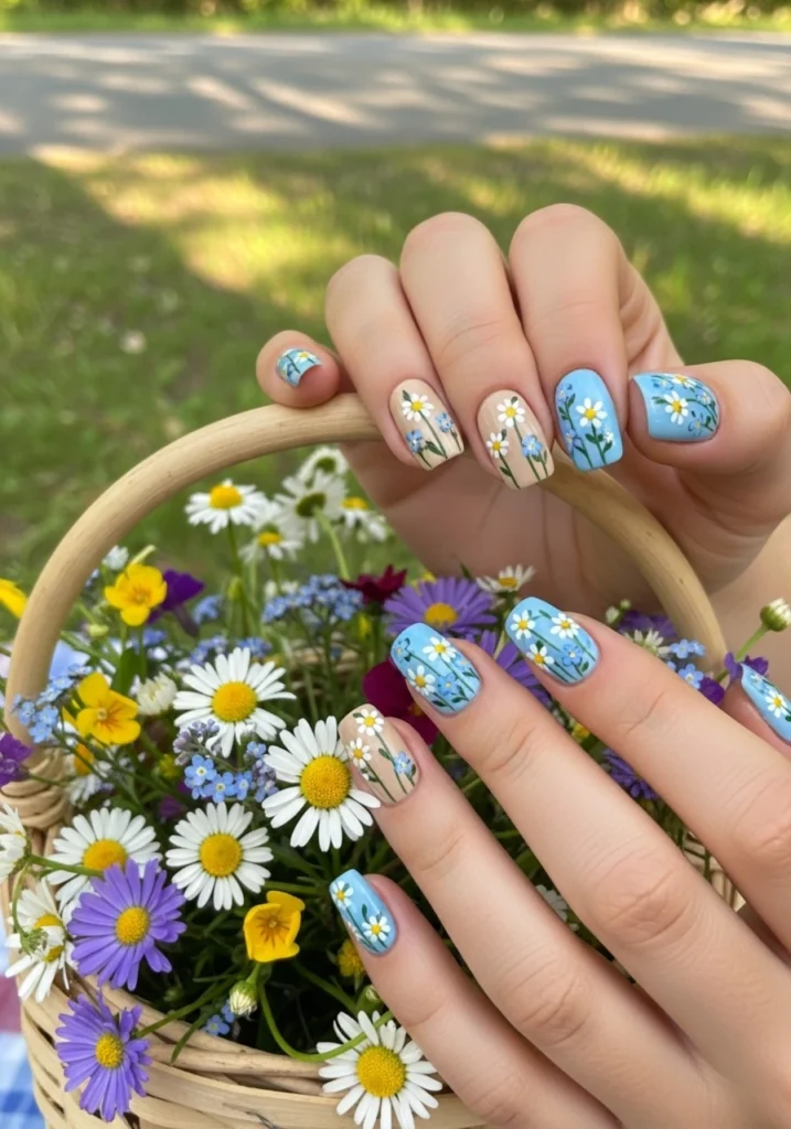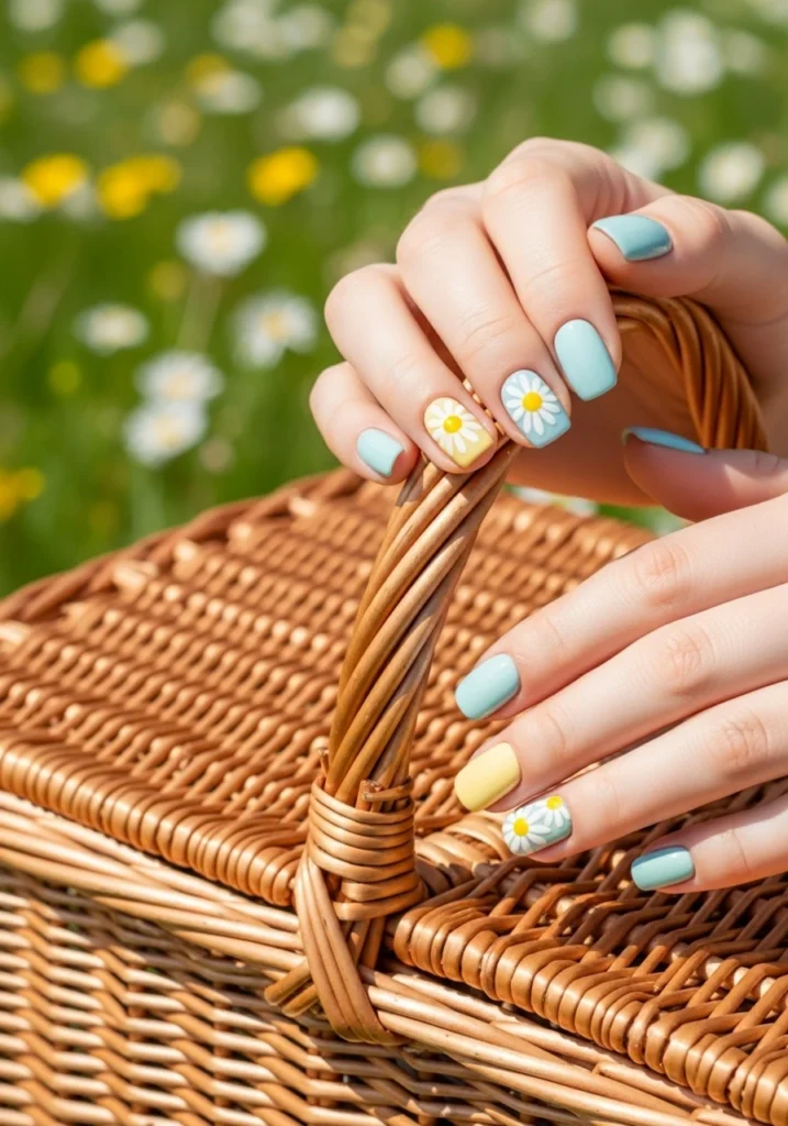 The design feels fresh, feminine, and effortless while offering plenty of room for play: mix solid daisy nails with full single-color nails for balance, or scatter the daisies like a wild field in bloom.