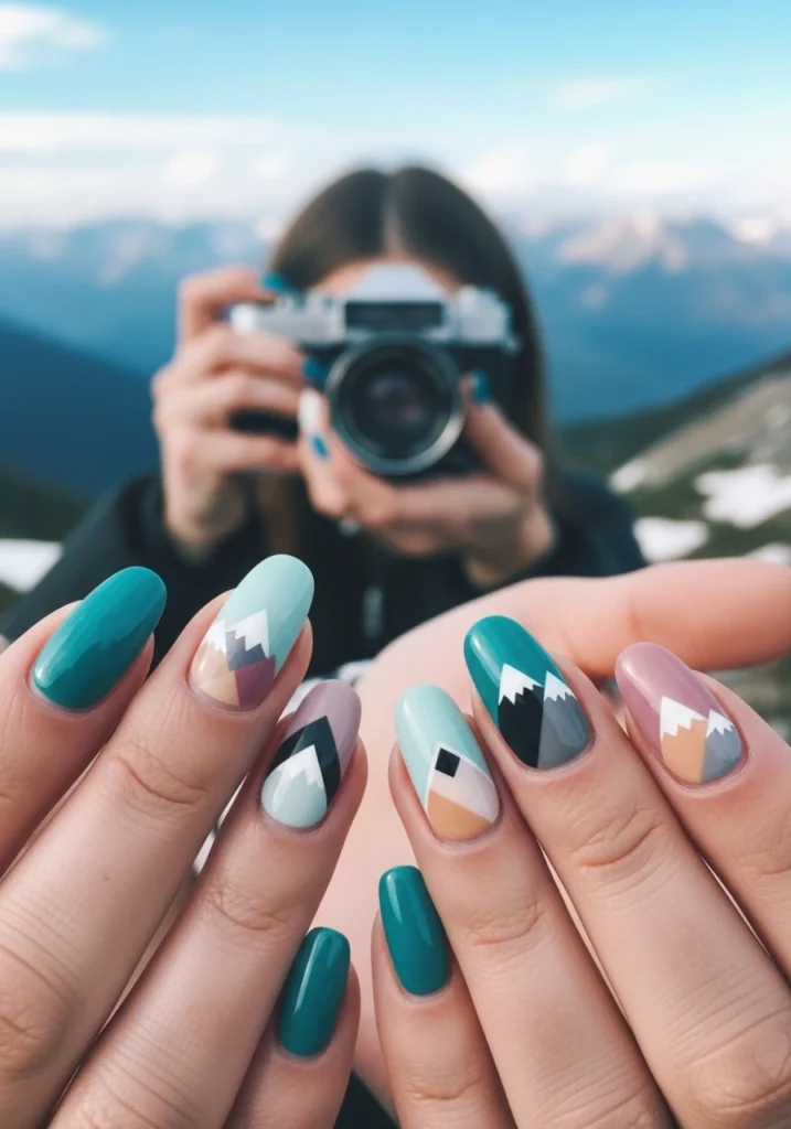 The peaks taper elegantly across each nail, sometimes capped with a touch of white “snow.” With its modern, minimal aesthetic, Mountain Mood nails fit perfectly with hiking gear, neutral knits, or denim jackets and look incredible against scenic backgrounds in travel photos.