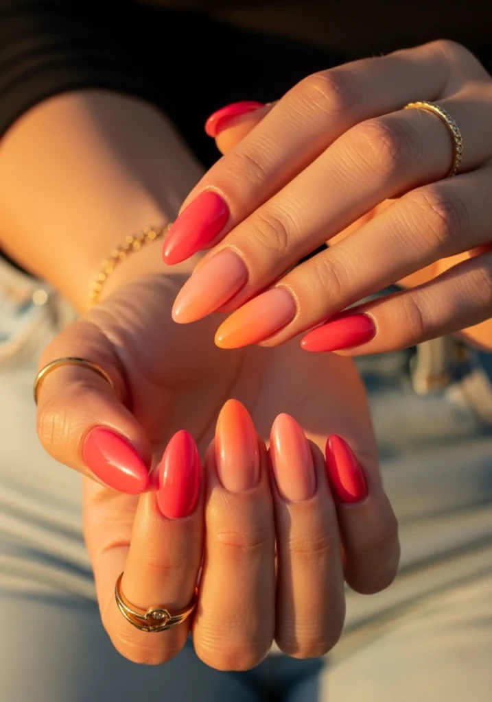The quintessential road trip sky turned into wearable art. These nails feature a seamless gradient starting from deep coral at the cuticle, bleeding into vibrant orange, and finishing in a soft peach haze at the tips.