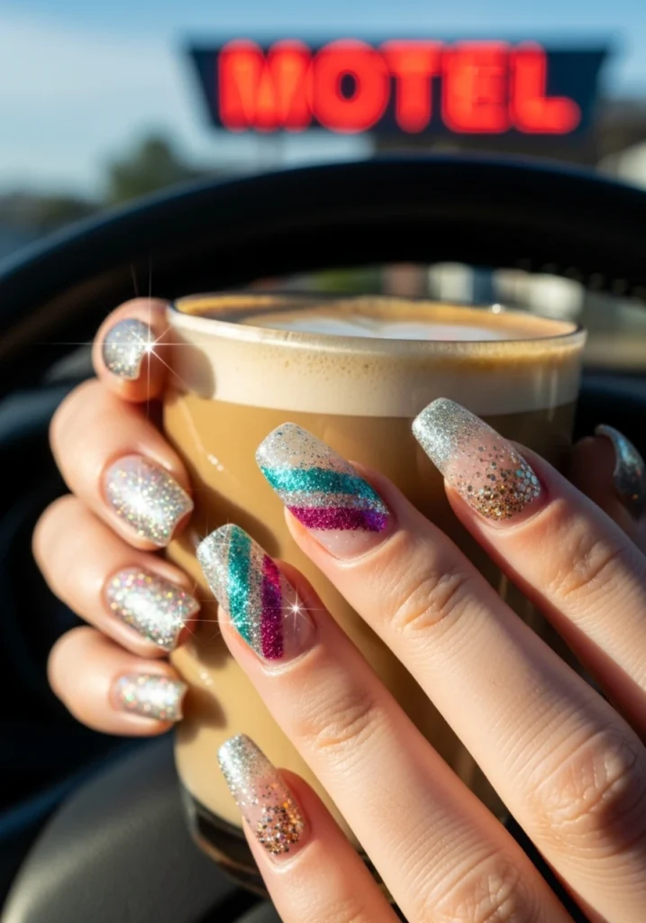 Sometimes your road trip just needs a hint of sparkle. Apply a sheer or solid base of your choice, then sweep glitter silver, turquoise, pink, or gold either along the tips for a French glitter fade or diagonally for a sense of movement.