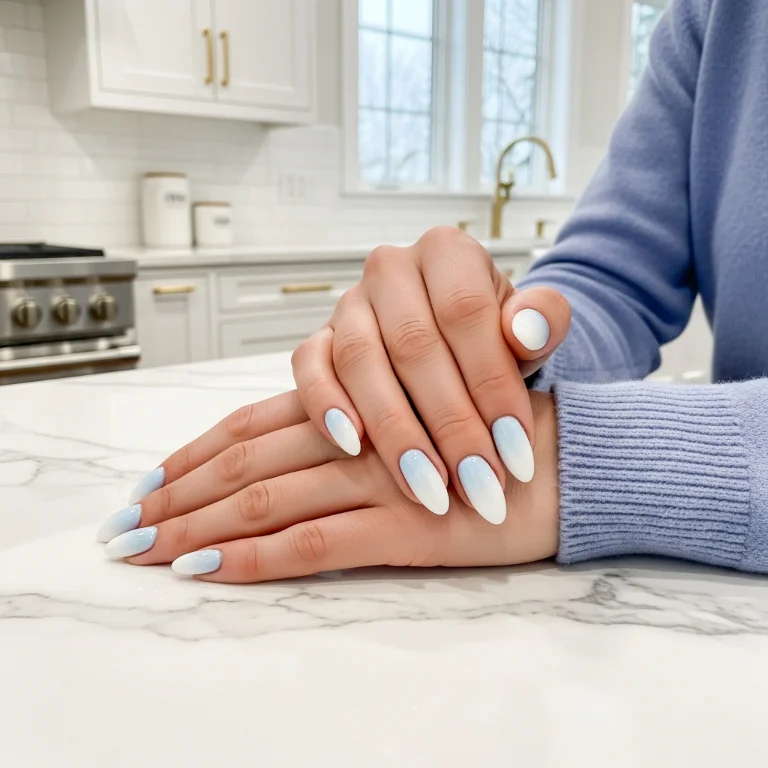 Gradient from white to pale blue mimics snowdrifts. This nail technique creates soft transitions. The ombre feels natural and pretty.